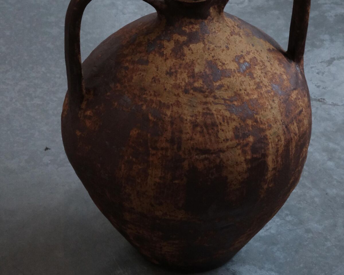 This form has been produced in Sardegna for many generations, used traditionally for transporting water by hand. The generous handles allow an arm to be slung underneath. After seeing antiques of this shape and character I was inspired to recreate the spirit of these brocca forms. Made on a kick wheel using the coiling methods I studied in Korea, and the surface is finished with kaolin and wood ash. The clay body is made of foraged wild clays from the Sierra Nevada mountains in California.
